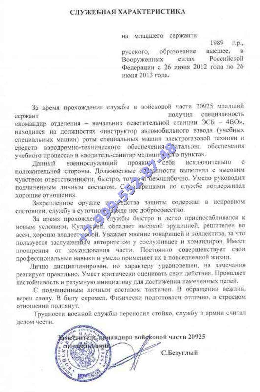 Личная характеристика с места службы на фирменном бланке воинской части/иного ведомства: от 10000 до 25000 руб + доставка.